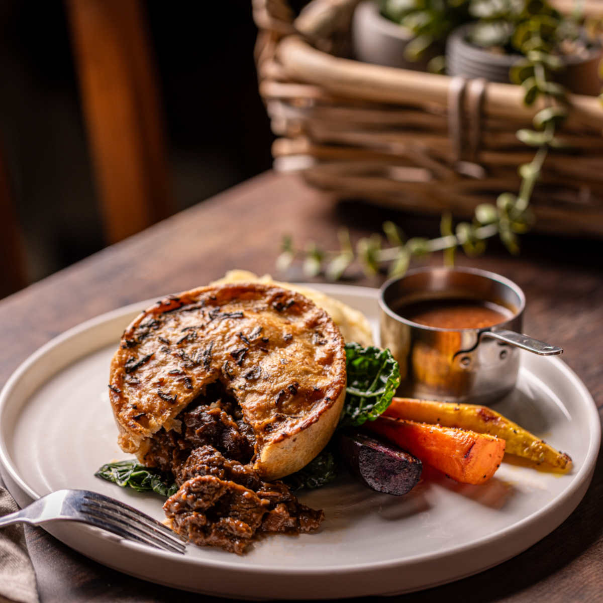 British, organic steak & ale pie, mash, roasted roots, buttered cavolo nero | 19 1107 kcals