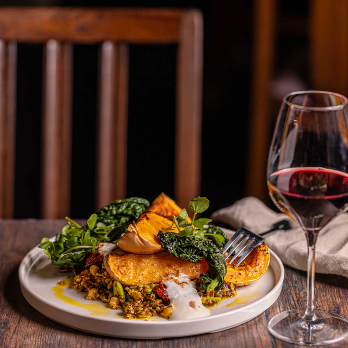 Warm roasted butternut squash salad, cavolo nero, green beans, herb yoghurt (ve) | 15.5 169 kcals