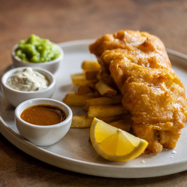 Golden, crispy, and utterly satisfying - our fish & chips are served with skin on fries, minty mushy peas, tartar sauce, and a rich curry dip. Finished with fresh lemon wedges for that perfect zing.