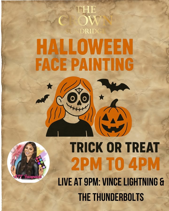 Join us for face painting by the lovley @att_facepaint and trick-or-treats between 2–4PM, and a spooktacular live set from Vince Lightning & The Thunderbolts at 9PM!